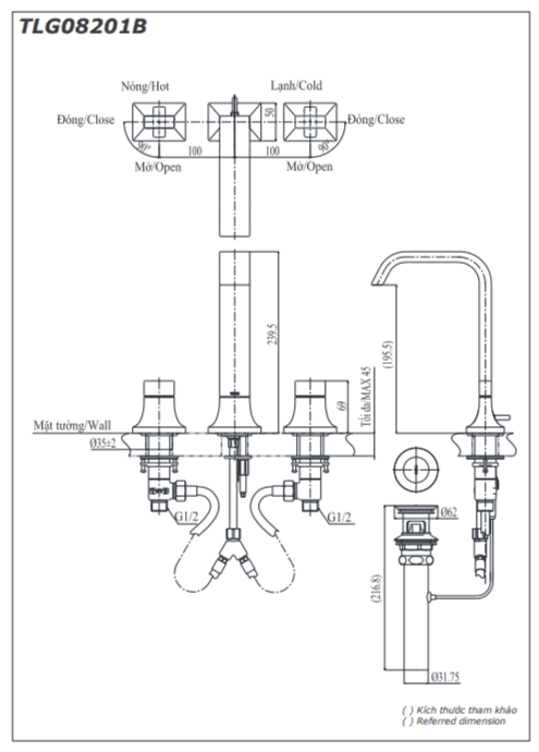 Bản vẽ Vòi Lavabo TOTO TLG08201B#BFG Tay Vặn Nóng Lạnh GC (3 Lỗ)