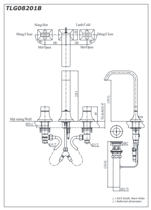 Bản vẽ Vòi Lavabo TOTO TLG08201B#PBR Tay Vặn Nóng Lạnh GC (3 Lỗ)