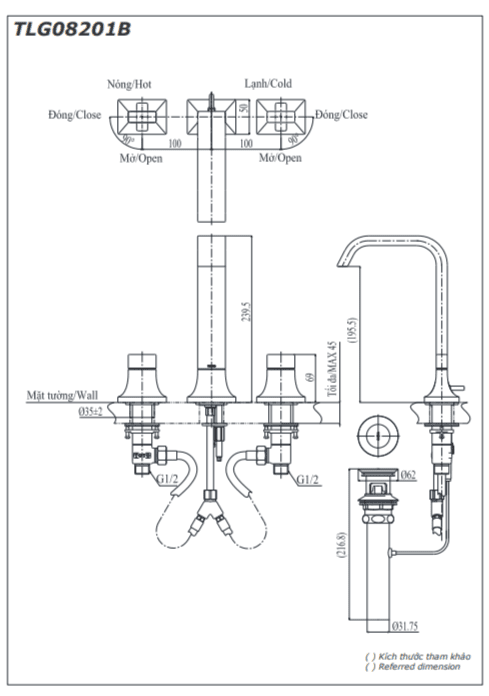 Bản vẽ Vòi Lavabo TOTO TLG08201B#PFG Tay Vặn Nóng Lạnh GC (3 Lỗ)