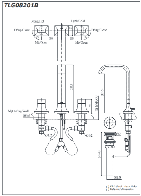 Bản vẽ Vòi Lavabo TOTO TLG08201B#PN Tay Vặn Nóng Lạnh GC (3 Lỗ)