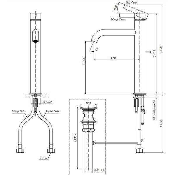 • Áp lực nước: 0.05MPa ~ 0.75MPa