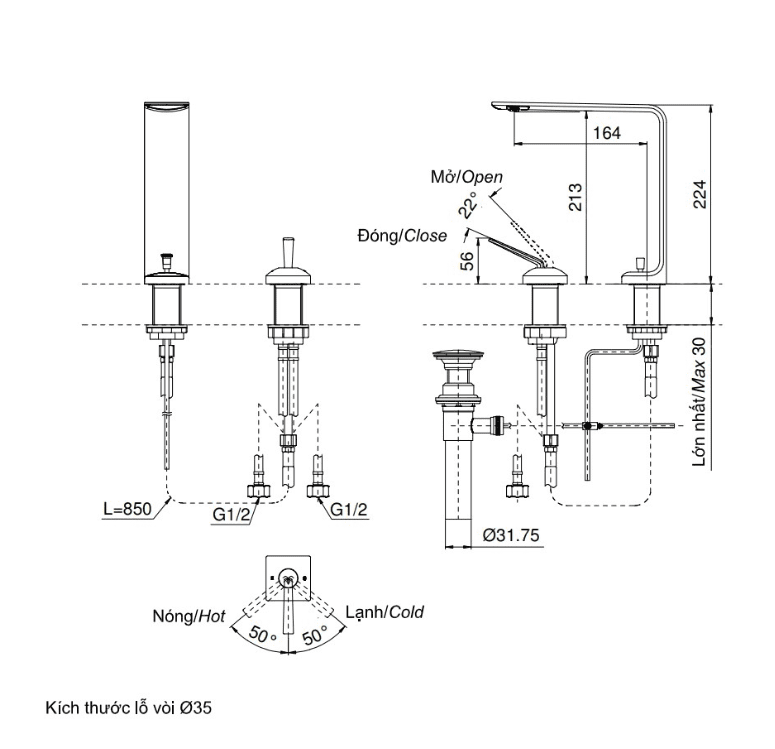 • Kích thước chiều cao vòi xả: 224  mm (H)