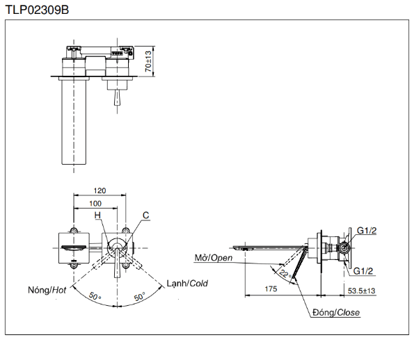 Thông số Vòi Lavabo TOTO TLP02309B#BFG Gật Gù Nóng Lạnh Gắn Tường ZL (2 Lỗ)