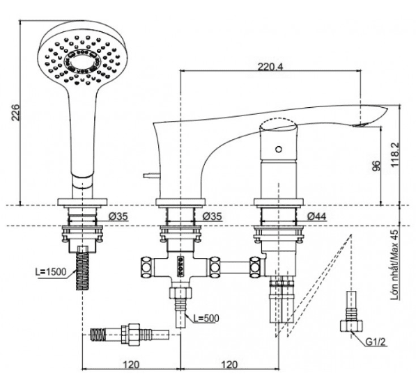 Bản vẽ Vòi Xả Bồn TOTO TBG01305BB Nóng Lạnh Kèm Sen Tắm