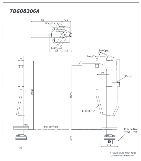 Bản vẽ Vòi Xả Bồn TOTO TBG08306A/TBN01105B Đặt Sàn Nóng Lạnh Kèm Sen Tắm